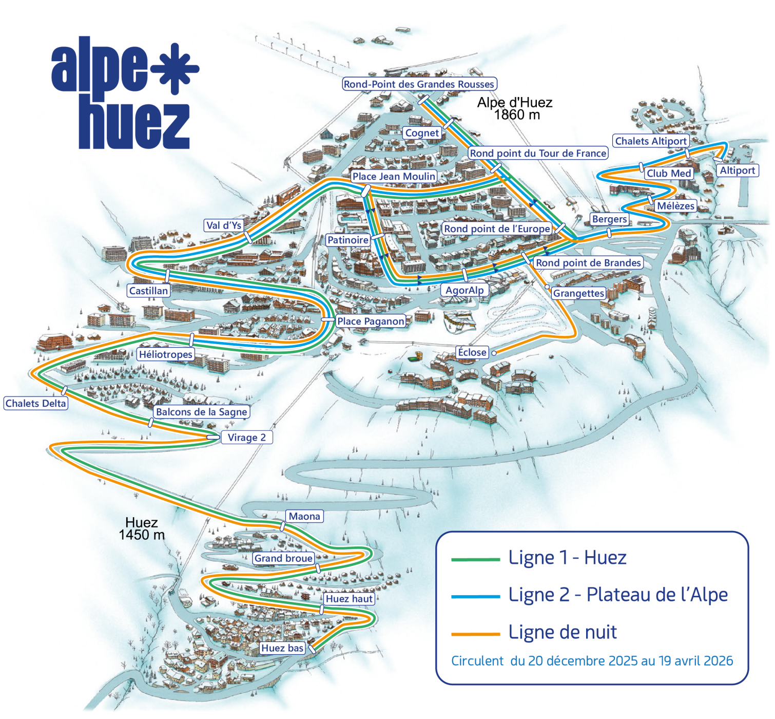 Horaires de la ligne La ligne 1 - Huez - Pistes circule du samedi 20 décembre 2025 au dimanche 19 avril 2026. Elle dessert les secteurs d'Huez et de l'Alpe d'Huez. Mise en service: Du 21 décembre 2020 au 01 janvier 2021 et du 07 février au 05 mars 2021